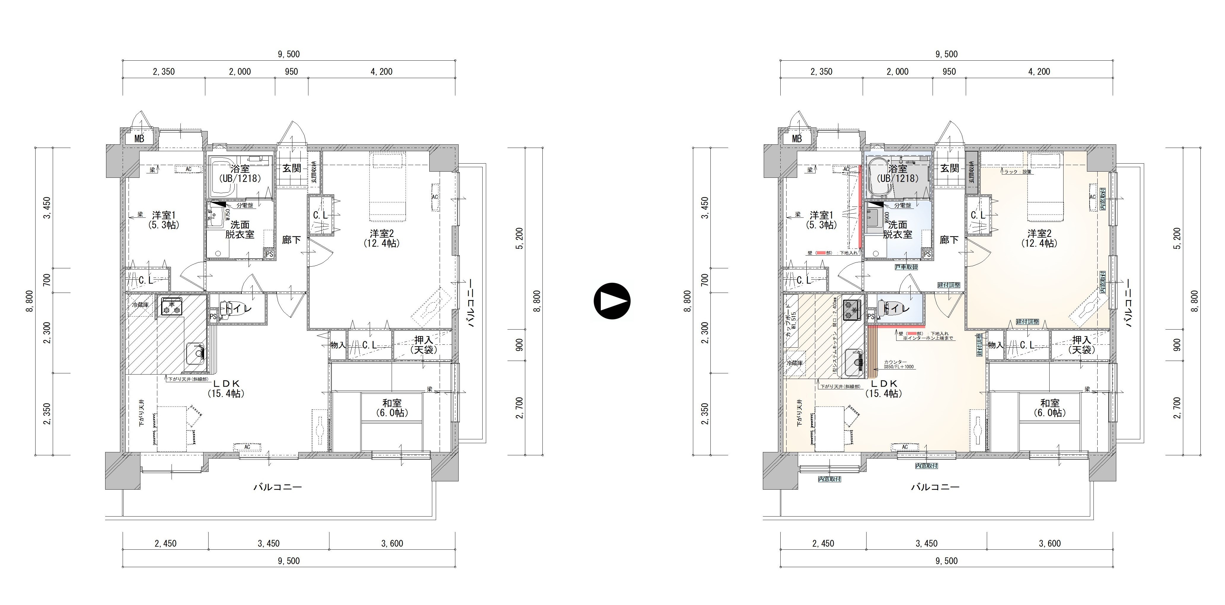 工事前はキッチンがL型でキッチン前面は垂壁、キッチン横に関しても壁があり、