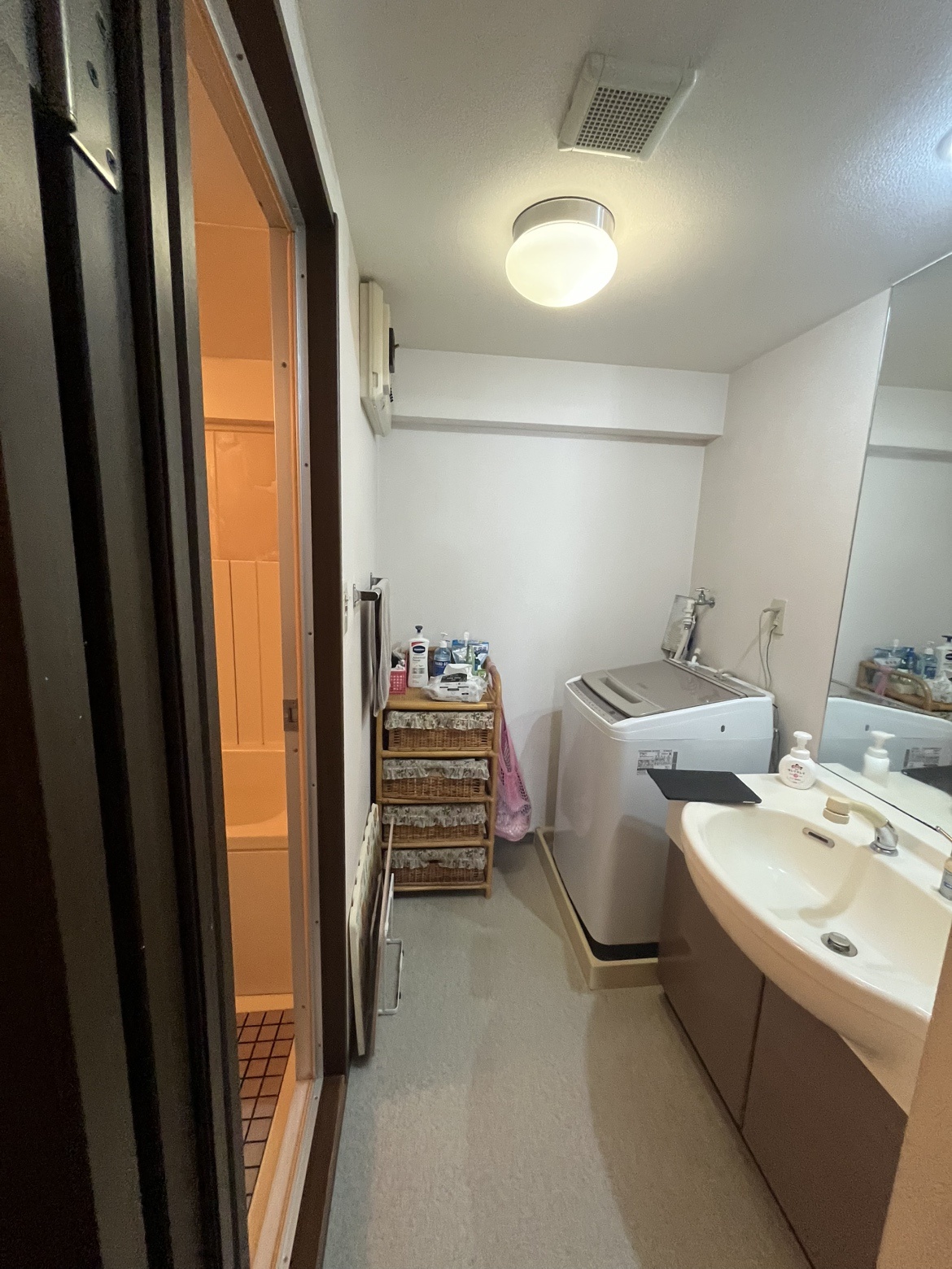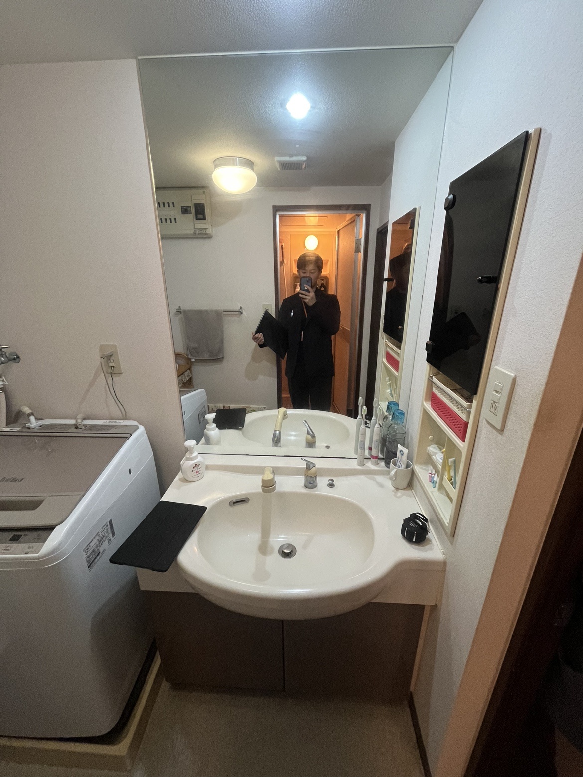 既存の洗面化粧台は開き扉で鏡裏収納なしの一面鏡タイプの洗面化粧台でした。
