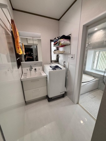 洗面所での施工例。洗濯機上部をマグネットパネルにすることによって洗剤や衣類等の置き場