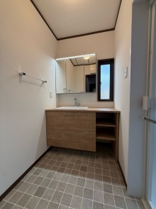 そこで今回は、二段引き出しタイプの洗面台を採用し、さらに三面鏡にすることで鏡裏にも収納スペースを確保。収納量を大きく増やすことができました。