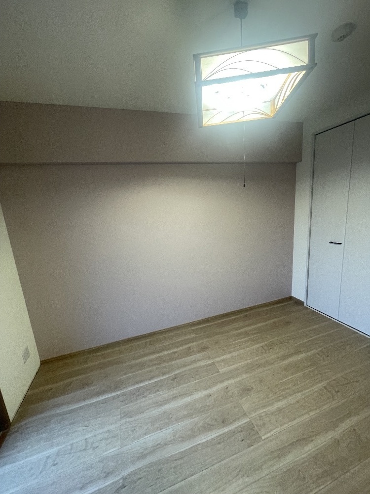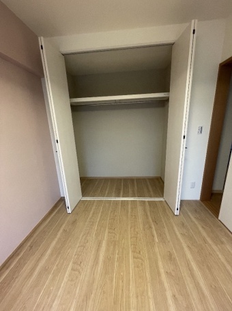 畳を剥がしてパーチを施工しフローリング仕上げ、押入は解体後枕棚(パイプ付き)を取り付けて長めのコートも掛けれるように仕上げています。