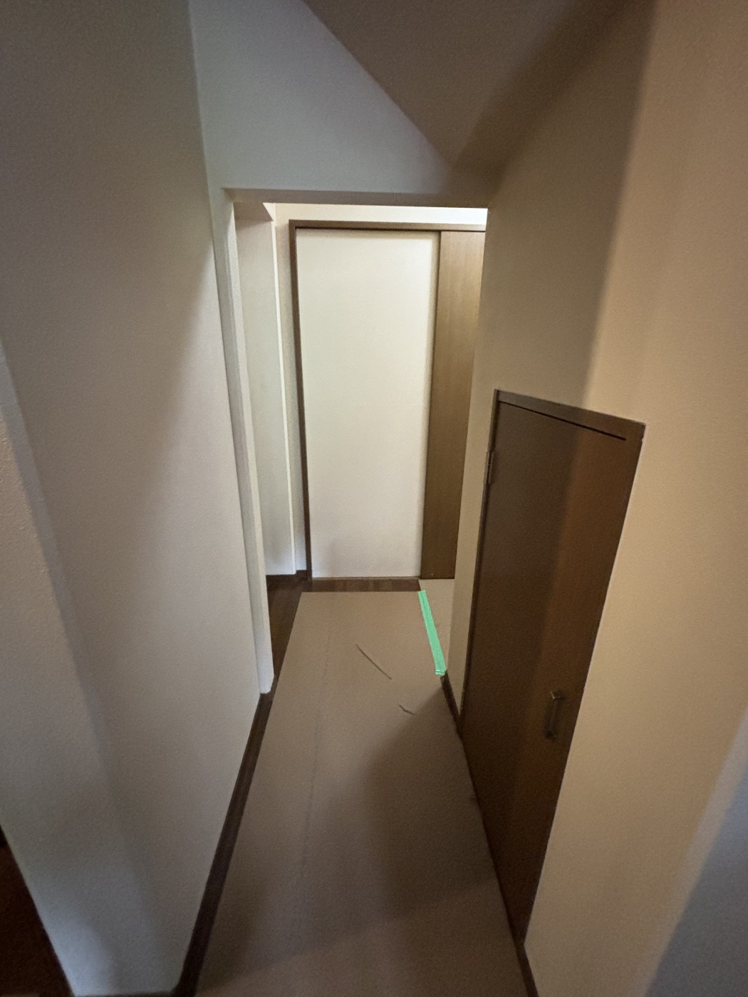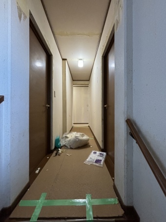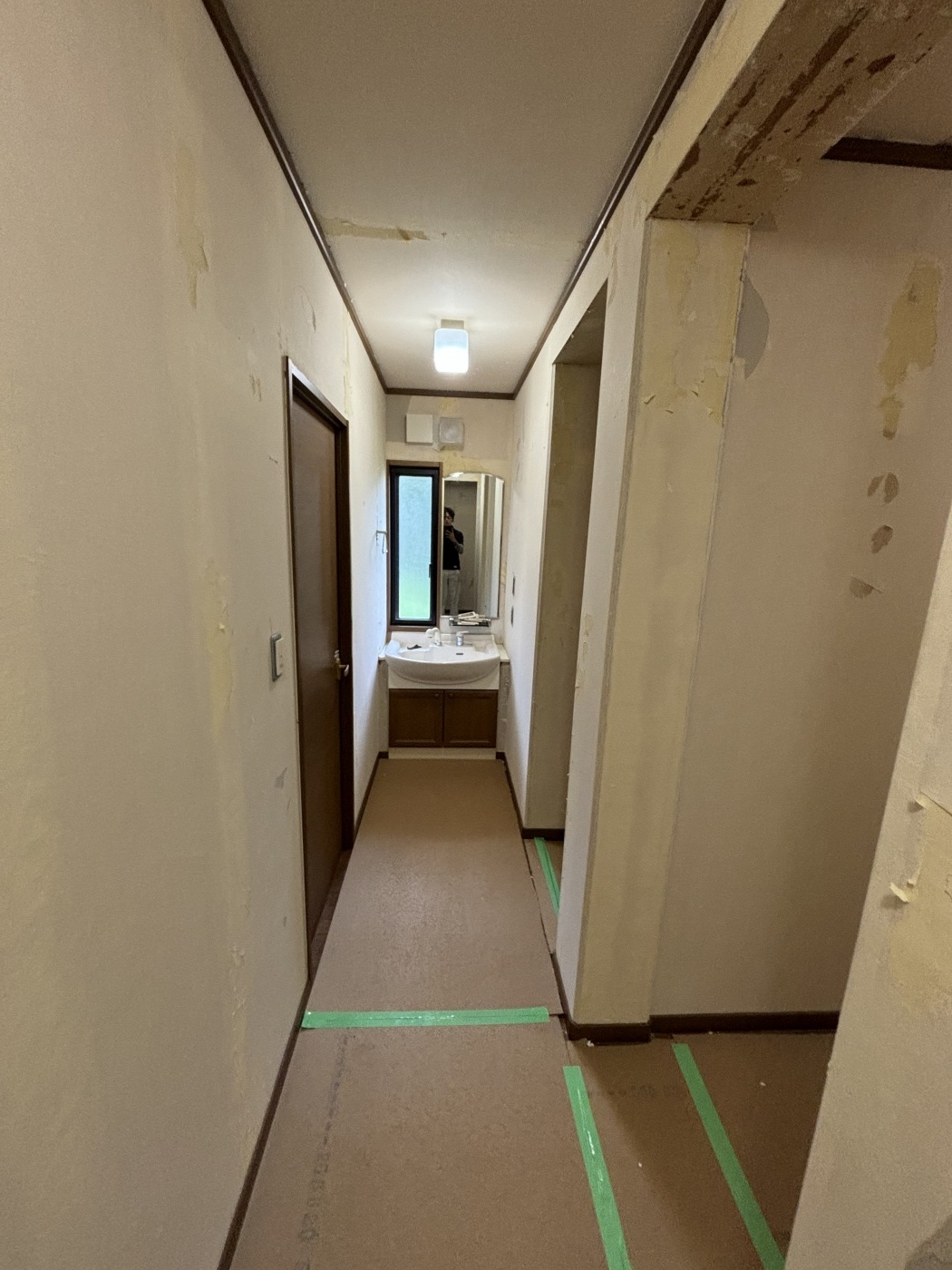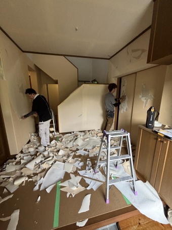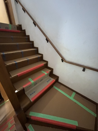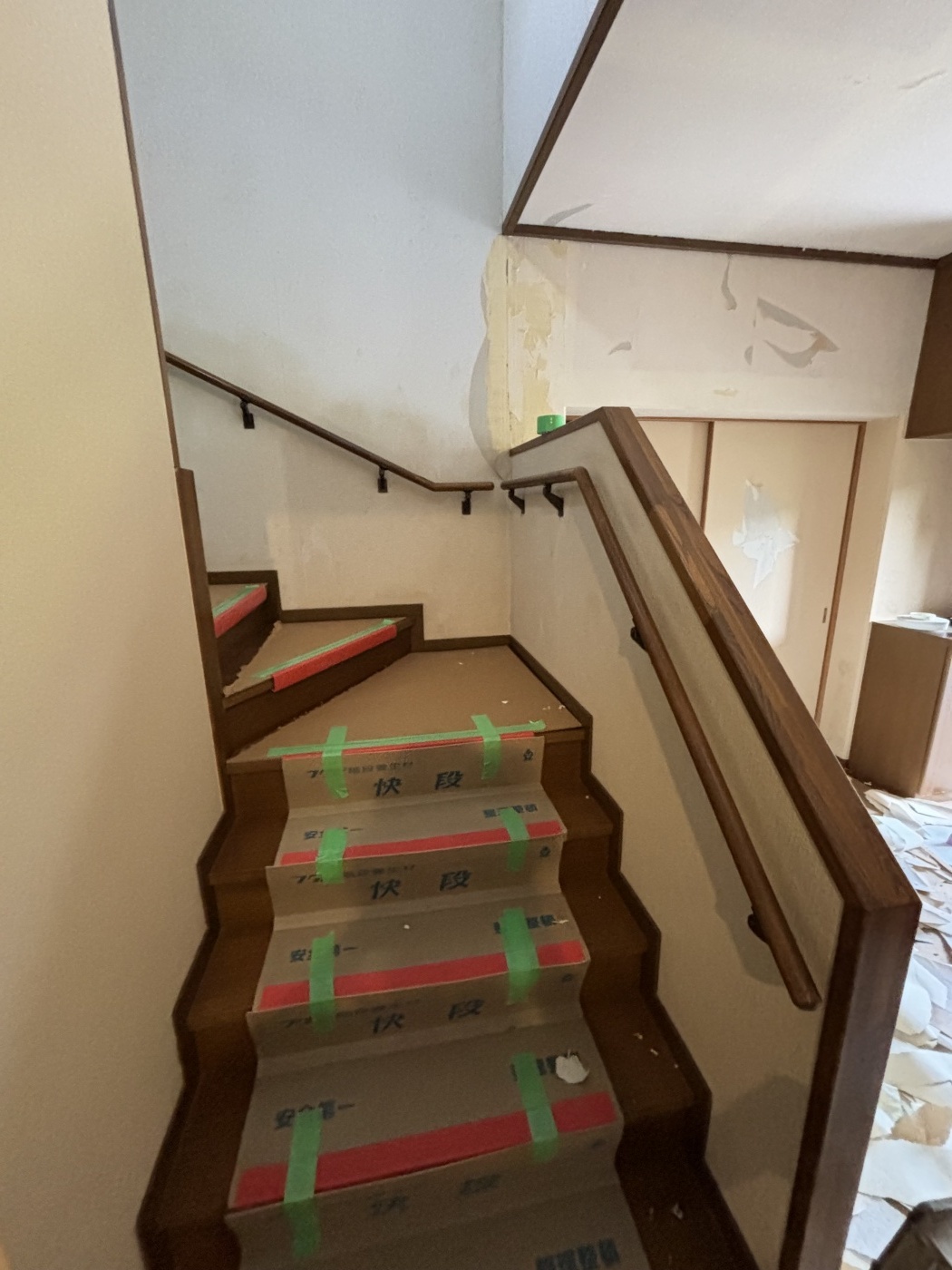 まずは、階段・廊下の養生をしっかりと行い、クロスをはがしていきます。