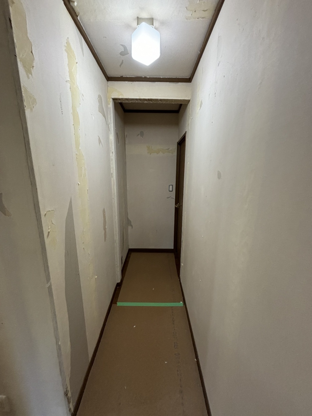 古いクロスをはがした後、パテで壁の補修を行いクロスを張っていきます。