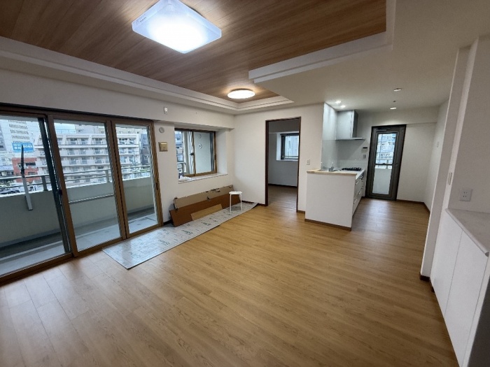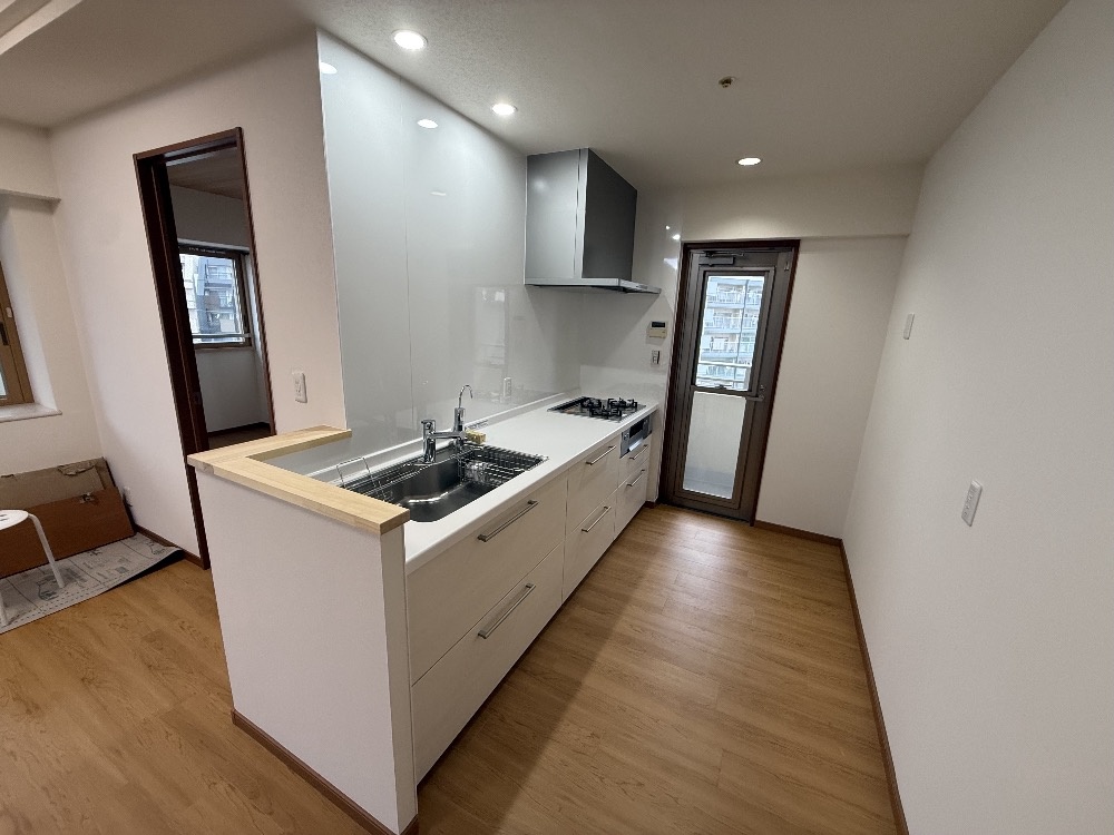 隣接する洋室収納の壁を撤去してそのスペースをLDKへ取り込み、キッチンの位置を調整することで、空間に一体感を持たせた開放的なLDKへと改善しました。あわせて既存床の上からフロアタイルを上貼りし、空間全体に統一感と耐久性を確保しています。さらに既存窓の内側に内窓を設置し、断熱性・気密性を高めることで、快適性の向上にも配慮しました。