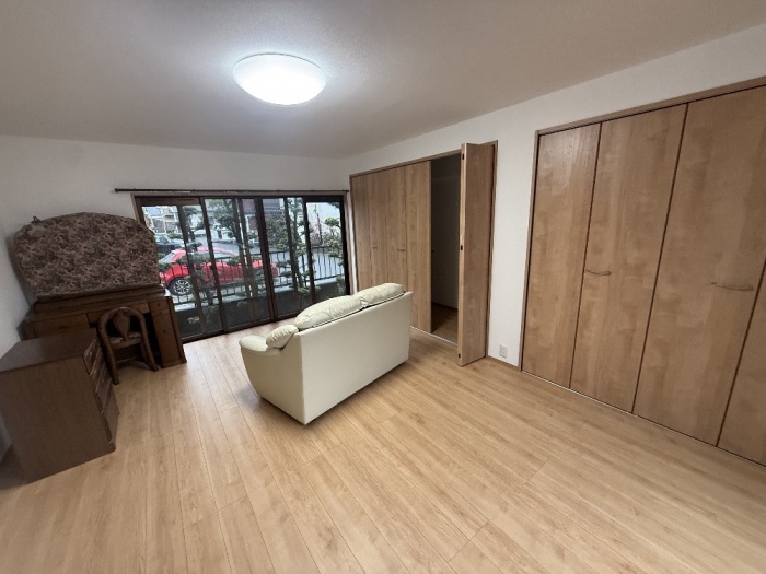 今回の工事では、畳を撤去してフローリングへ変更し、壁・天井のクロスも張替えを行い、明るく使いやすい洋室へとリフォームいたしました。あわせて、既存の押入れをクローゼットへ改修し、内部はあえて棚やハンガーパイプを設けず、お客様がお持ちのラックをそのまま設置できるようにいたしました。これにより、使い慣れた収納を活かしながら、無駄のない使い勝手の良い空間となっております。また、壁面の一部を活用して新たに収納スペースを設け、全体の収納量も向上させました。