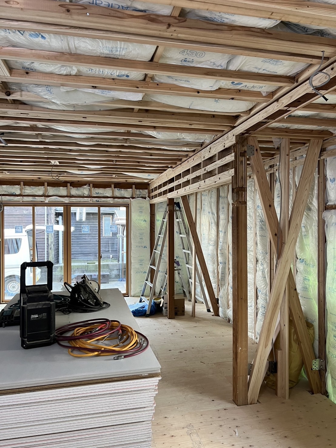 大工さんが床を組み直し、床に断熱材を入れ、床を伏せていきます。