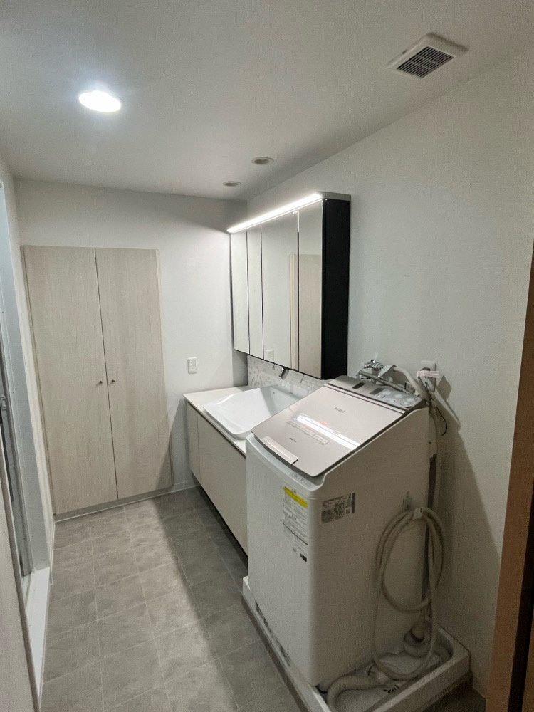 間仕切り壁を撤去することで、スッキリとした空間となり、洗面台もサイズアップしたことで、収納力もかなり上がってます!