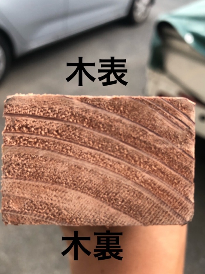 文字通り、木材には表と裏があるんです。丸太で考えた時に、中心に近い方が裏で外側が表です。