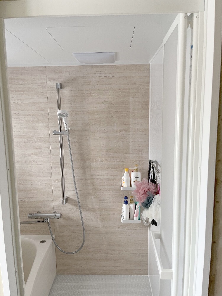 手すり兼用のスライドバーをオプションで追加したことがポイントです。将来を見据え、浴槽の出入りのサポートにもなる、手すりとしてもご使用いただけるものを設置しました。また、浴室内に鏡は無くてもよいとのことだったため、日々の掃除のしやすさを優先し、あえて鏡は外しました。