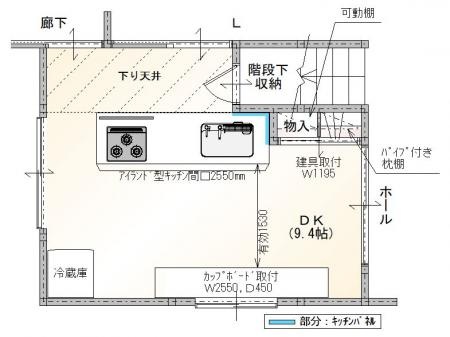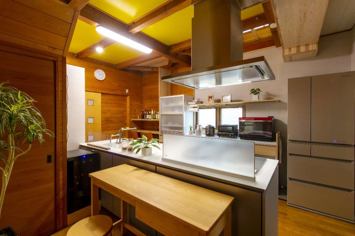 リビングにも食事ができる大きなテーブルがあったため、ダイニングテーブルを配置していた空間を利用して、壁付けのキッチンからアイランドキッチンへ変更することをご提案しました。また、カップボードやパントリーを設置し、収納スペースを大幅に増やしました。キッチン上部の吹き抜けは、採光は変わらずできるようアクリル板を使用してふさぐご提案をしました。