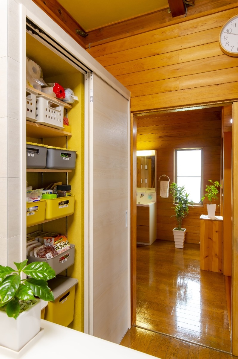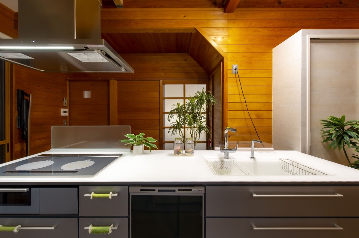 内装に杉の羽目板が使われている、こだわりの詰まったI様邸。ダクトまわりは杉の羽目板で造作するなど、お家全体の雰囲気を崩さないよう配慮しました。カップボード周りなど汚れがつきやすい場所には、耐久性・耐水性に優れ、お手入れしやすいフロアタイルを採用しました。