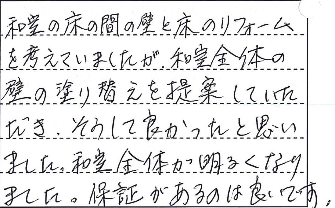 和室の床の間の壁と床のリフォームを考えていましたが、和室全体の壁の塗り替えを提案していただき、そうして良かったと思いました。和室全体が明るくなりました。保証があるのは良いです。