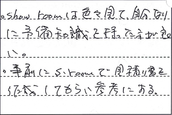 ・Show roomは色々見て、自分なりに予備知識を持った方が良い。 ・事前にS・roomで見積り書を作成してもらい参考にする。